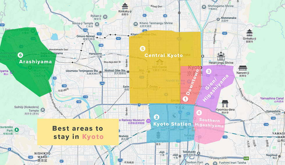 Op de afbeelding die ik heb gemaakt, zie je dat ik Kyoto heb opgedeeld in verschillende gekleurde vakken. Natuurlijk kun je ook prima verblijven in de gebieden zonder kleur, maar eerlijk gezegd: als ik daar toeristen zie lopen, denk ik vaak: "Wat doe je hier?"Ā Dat zijn vaak pure woonwijken zonder bezienswaardigheden.