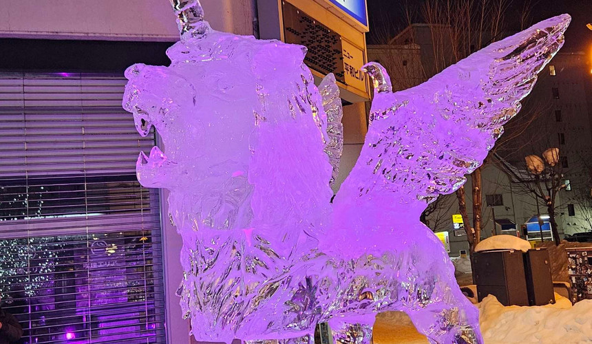 In het centrum van de stad op de Heiwa Dori voetgangers pad, dat ongeveer een kilometer lang is vanaf het station, staan allemaal ijssculpturen opgesteld. Die naar mijn mening veel indrukwekkender waren dan die in Sapporo. In de avond worden ze opgelicht waardoor ze nog mooier lijken!